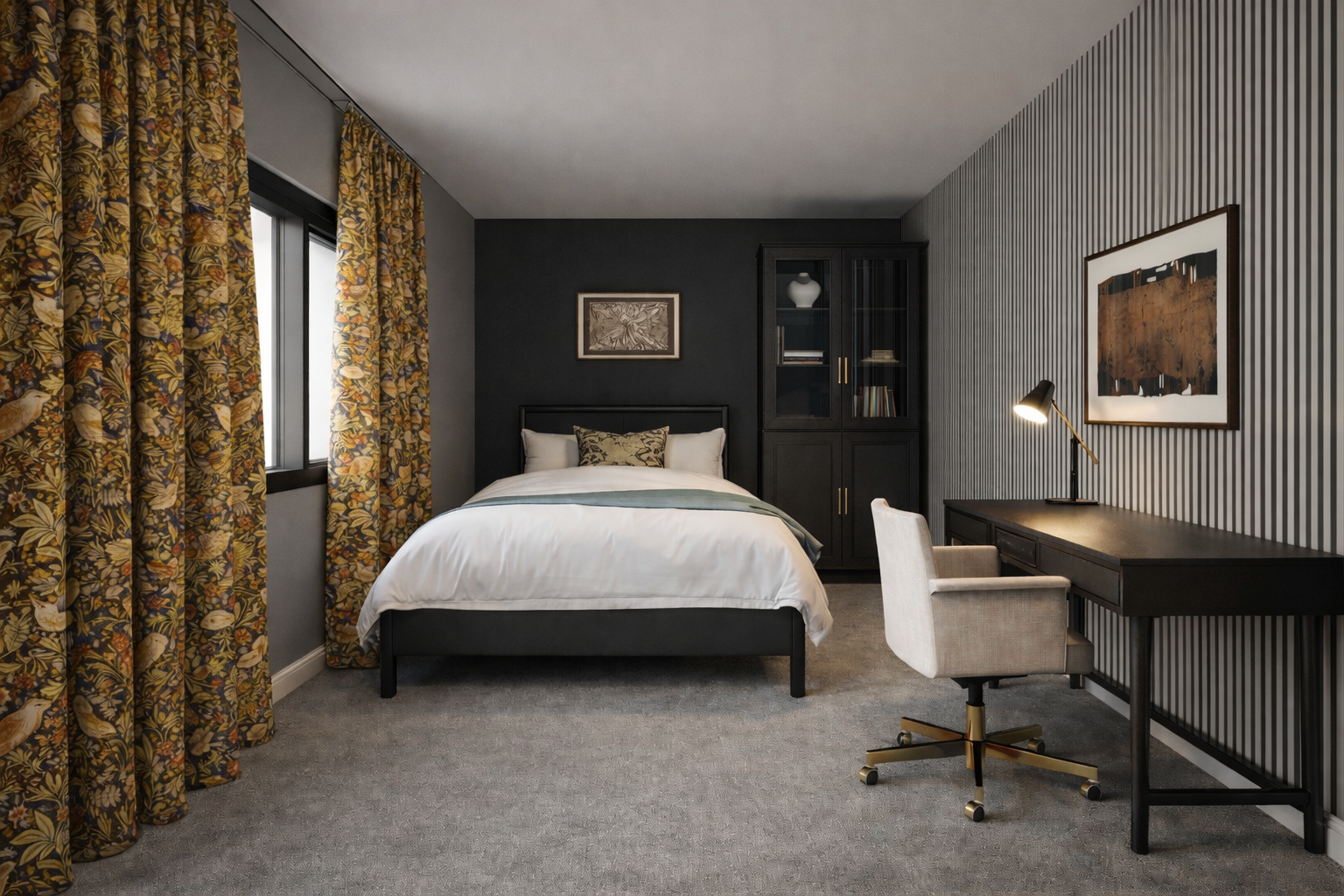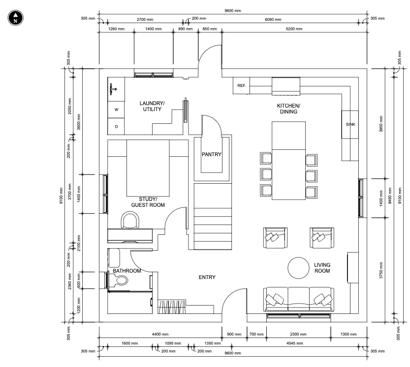 The new layout proposed, included all the clients requirements. The layout was carefully planned to include a separate study, which doubles as the guest room, a guest bathroom and a laundry space. The space under the stair case was modified into a pantry, to accommodate the clients storage needs. The kitchen and living area were planned as an open concept space to enable the client to cook, entertain and be involved with the guests at the same time. An additional outdoor patio was also included to accommodate the entire extended family.